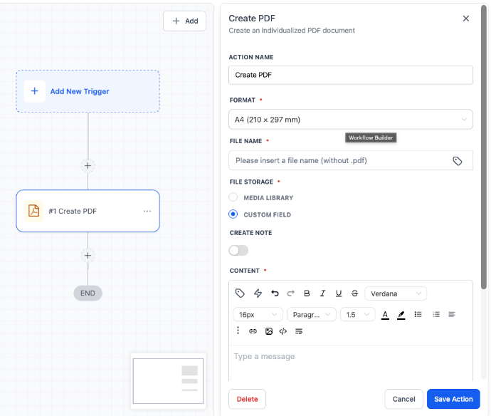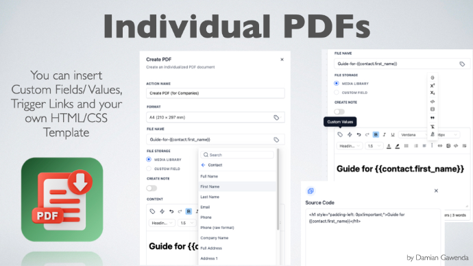 Generate personalized PDF Documents with an included Editor inside your Workflows Builder and save them in your CRM or send them to your contacts.